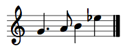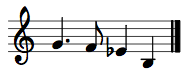 Pitch inversion occurs when all pitches are inverted, or flipped, around an axis of symmetry in pitch space (in other words, the axis of symmetry is a pitch). In the above melodic example, the axis is G4. Since the first pitch is G4, it remains unchanged. The next pitch (A4) is two semitones above G4; it is replaced with F4, two semitones below G4. B4 (i4 above G4) is replaced by E-flat4 (i4 below G4). And so on.