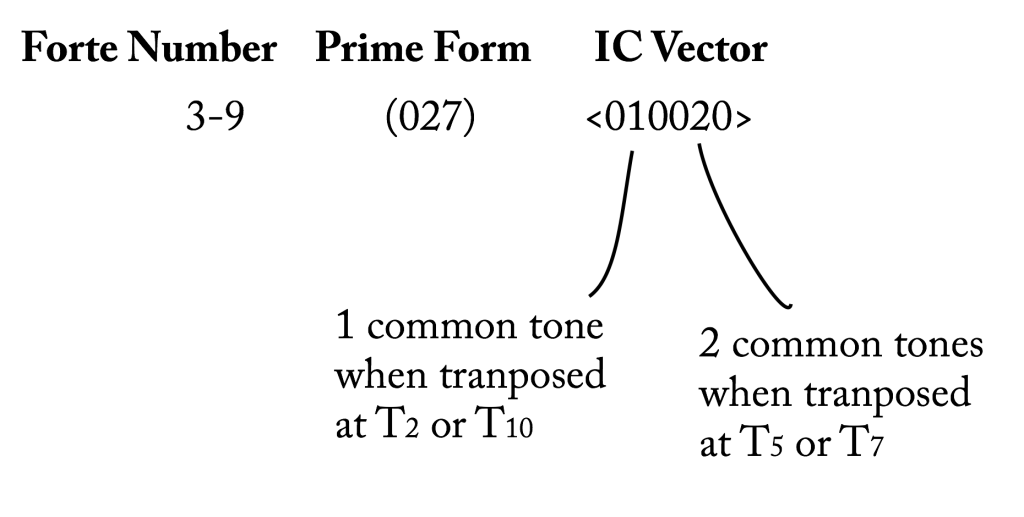 Those numbers also tell us how many common tones are retained when those sets are transposed by a member of that interval class. That is, because there is a 1 in the second column, a pitch class set belonging to (027) will retain 1 common tone when transposed by either T2 or T10. Because there is a 2 in the fifth column, it will retain 2 common tones when transposed by either T5 or T7.