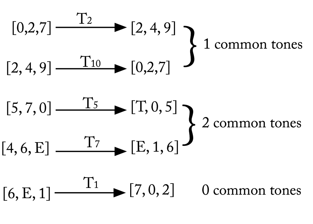 You can see this explicitly below. I've taken four arbitrary members of (027)—show on the left—and transposed them in various ways. As indicated above, only T2, T10, T5, or T7 will keep common tones. Any other transposition will have zero common tones.
