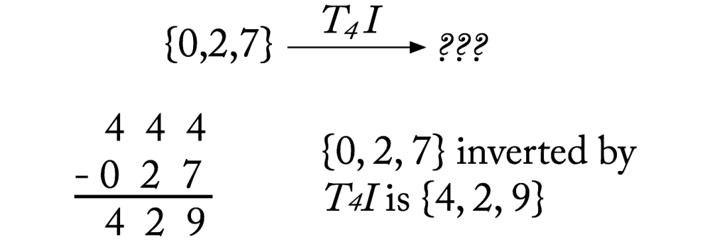 Fortunately, there is a much quicker way to invert a pitch or collection of pitches! Given any collection of pitch classes and a TnI, simply subtract the the pitch classes from n: