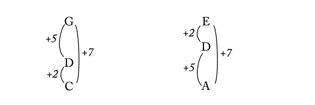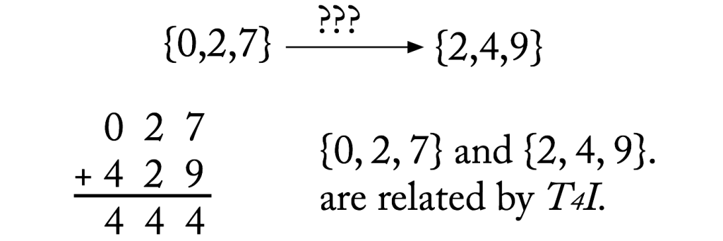Conversely, to determine the TnI that relates two collections of pitch classes, find a common value to which they all sum. That is the n in TnI: