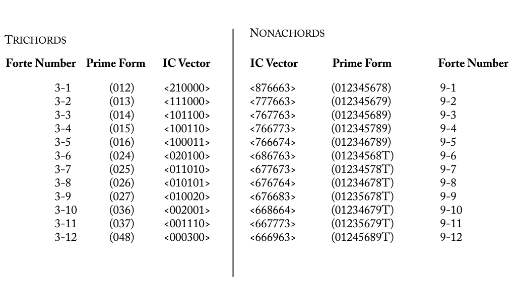 Most of these set-class lists are organized similarly. Set classes that have the same number of notes in them (we say that they have the same "cardinality") are grouped together: trichords (three-note pitch-class sets) sit together, as do nonachords (nine-note pitch-class sets), and so on.